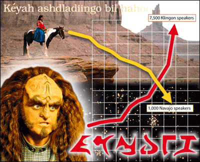 "Navajo, a 3,000-year-old Native American tonal language belonging to the Athabaskan/Na-Dené group of tongues, is clearly dying and will likely be extinct by 2010," MLA president Frederick Toback said. "Fortunately, though, the sad, steady decline of this once-proud Native American tongue has been more than offset by a rising interest in Klingon culture."