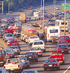 | Above: Traffic moves slowly near Seatte, WA, where a majority of drivers say they support other people using mass transit. |